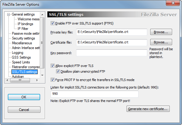- Enable FTP over SSL/TLS support (FTPS) – aktiver sikker FTP